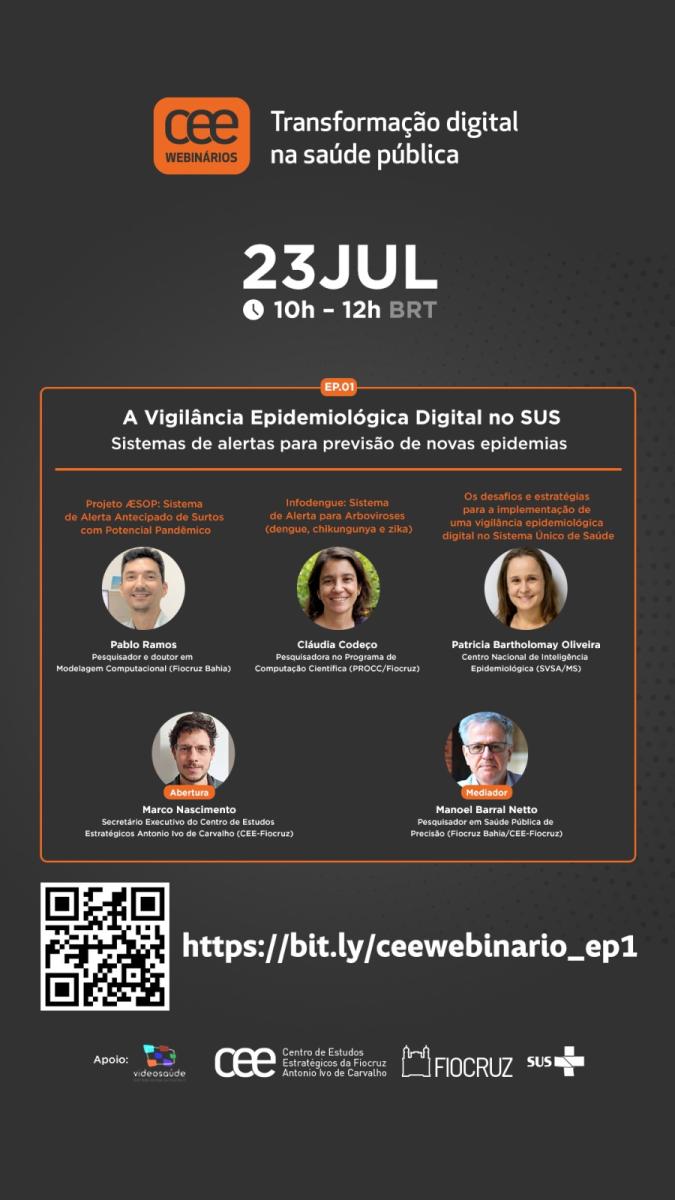 Estarão reunidos o pesquisador da Fiocruz Bahia Pablo Ramos, doutor em Modelagem Computacional, vice-coordenador do do Centro de Integração de Dados e Conhecimentos para Saúde (Cidacs/Fiocruz), que abordará o projeto AESOP, um sistema de alerta para surtos com potencial pandêmico a pesquisadora Claudia Codeço, do Programa de Computação Científica (Procc/Fiocruz), que apresentará o Infodengue, um sistema de alerta para arboviroses; e Patricia Bartholomay Oliveira, do Centro Nacional de Inteligência Epidemiológica do Ministério da Saúde. A coordenação e mediação do evento serão do professor e pesquisador em Saúde Pública de Precisão Manoel Barral, da Fiocruz Bahia e CEE-Fiocruz, e a abertura, do secretário executivo do CEE, Marco Nascimento.